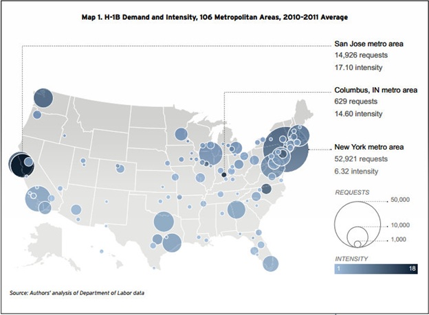 • USCIS received 250 or more H1-B requests from 106 metropolitan areas during 2010-2011 periods.